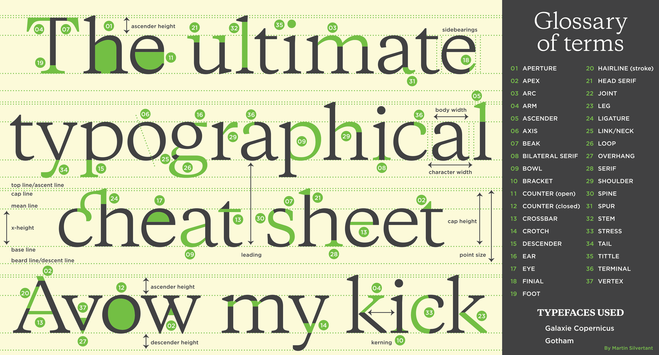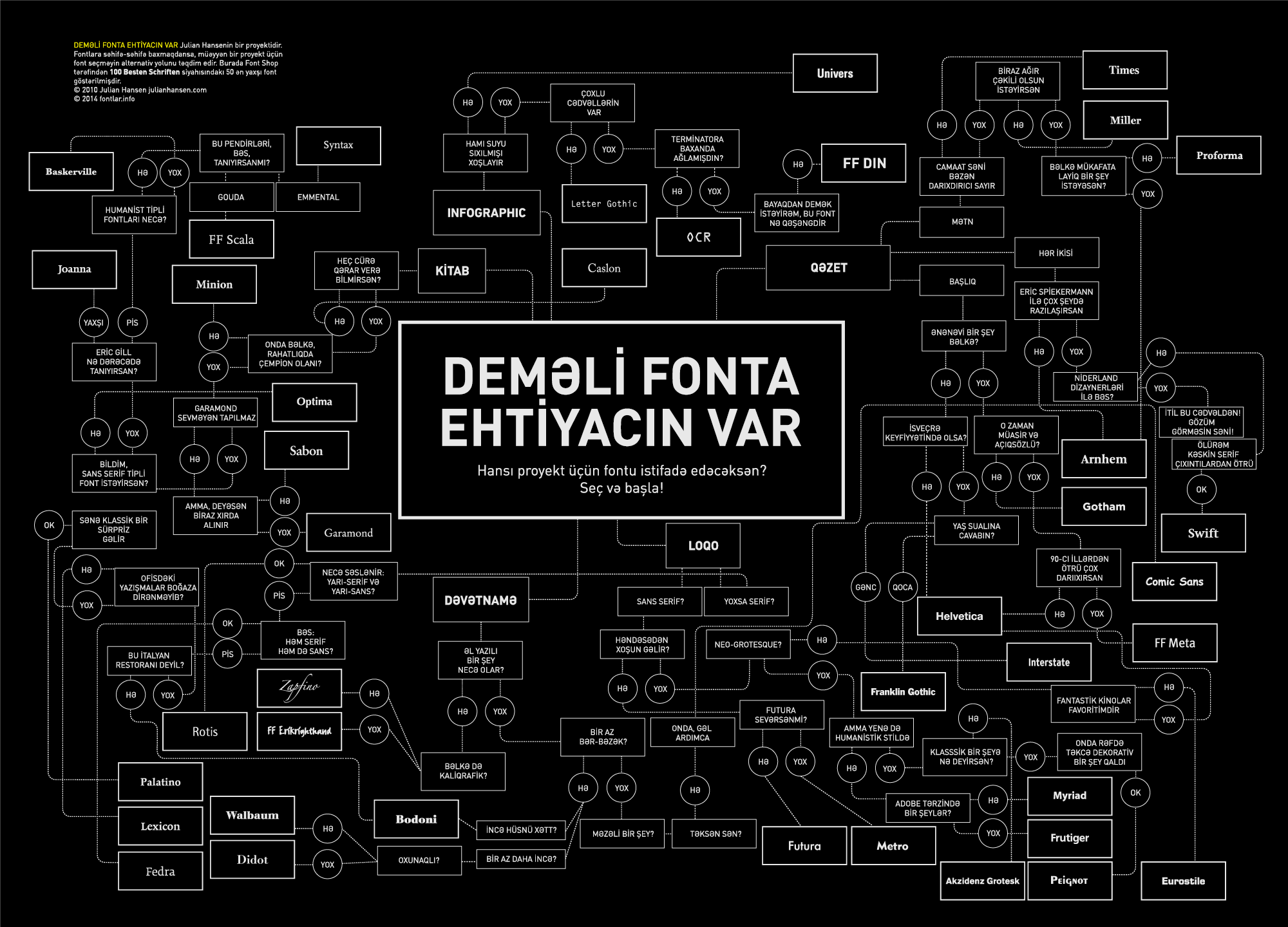 Bu infografik Niderlandlı tələbə Julian Hansen tərəfindən hazırlanıb. Fontlara səhifə-səhifə baxmaqdansa, müəyyən bir proyekt üçün font seçməyin alternativ yolunu təqdim edir. Burada Font Shop tərəfindən 100 Besten Schriften siyahısındakı 50 ən yaxşı font göstərilmişdir.