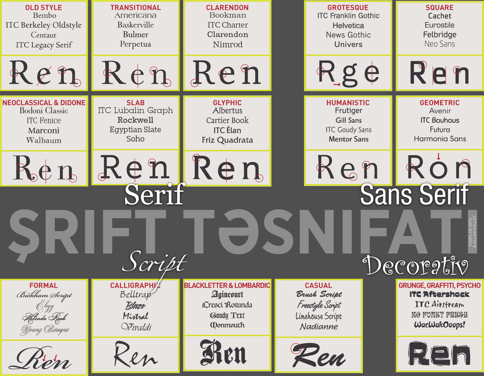 ardıSerif - kiçik hərf çıxıntılarıdır. Bu çıxıntıları olan fontlarla çap olunmuş yazılar adətən gözü yormur. Bu səbəbdən kitablar və qəzetlərdə mətnlərdə çox istifadə olunur (good for readability). Belə serif fontlara ən məşhur misal olaraq Times, Garamond, Georgia fontunu misal göstərmək olar.